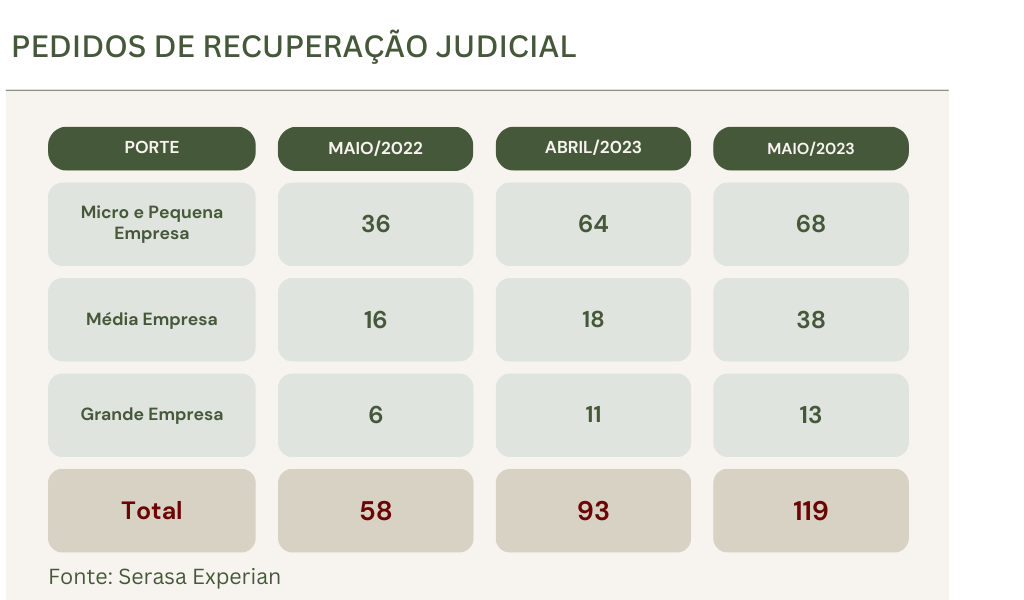 É significativo o aumento de pedidos de recuperação judicial no primeiro semestre de 2023, correspondente a 52,1%, em comparação ao mesmo período no ano anterior. O maior nível em três anos. Só em maio de 2023, apurou-se incremento de 105,2% em relação ao mesmo mês do ano anterior: